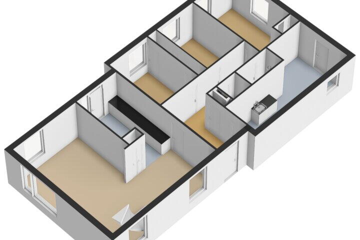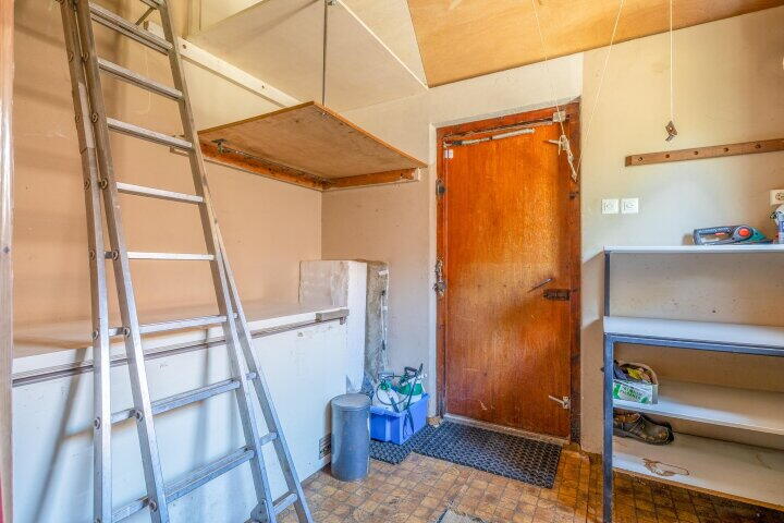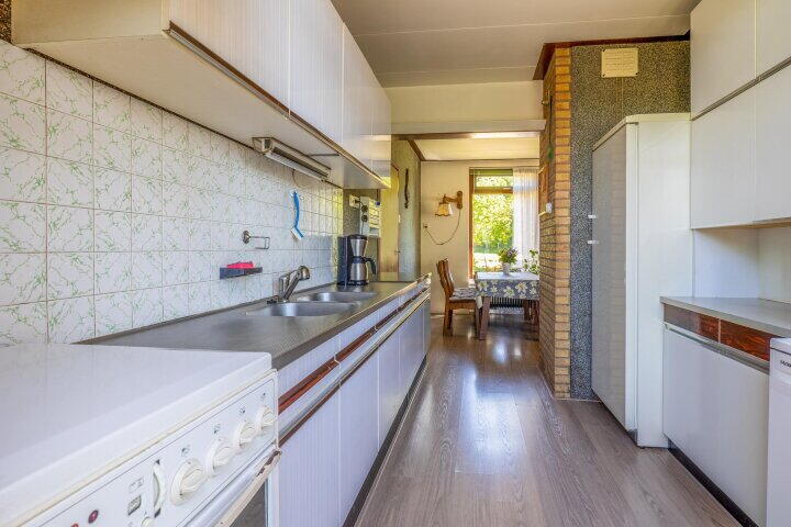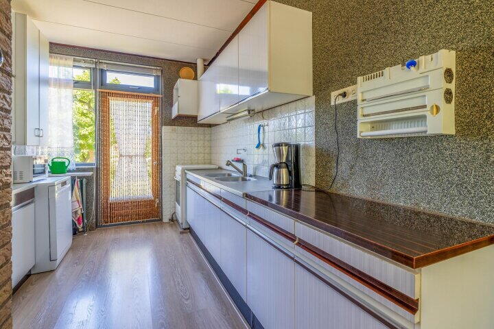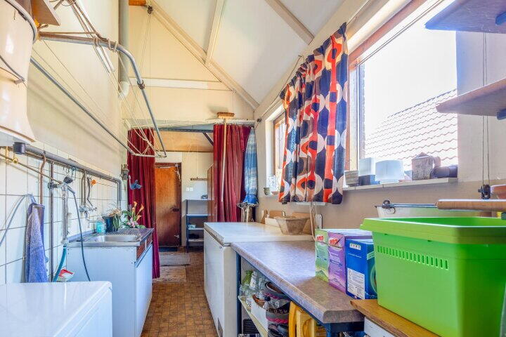 Je komt aan de zijkant binnen in de L-vormige hal met meterkast, toegang tot de bijkeuken, toilet, badkamer, 3 slaapkamers en de woonkamer met keuken. De 3 slaapkamers zijn allen voorzien van vaste kasten, cv radiator en één of twee ramen voor natuurlijk daglicht en ventilatie. De badkamer is grotendeels betegeld en heeft een douche, radiator en een vaste wastafel. Naast de badkamer is een separaat toilet met fonteintje. De woonkamer is heerlijk licht door de grote raampartij. Hier ligt een laminaatvloer en er is naast centrale verwarming ook een gaskachel. Een open wenteltrap in de kamer brengt je naar de bovenverdieping. De eenvoudige keuken heeft veel bergruimte en een dubbele wasbak. Via de deur in de keuken kun je naar de zijtuin van de woning. Verder is er vanuit de hal een ruime bijkeuken bereikbaar met witgoedaansluiting en een klein aanrecht met wasbak. Daar achter is nog een ruimte met een deur naar buiten naar de achterzijde van de woning.